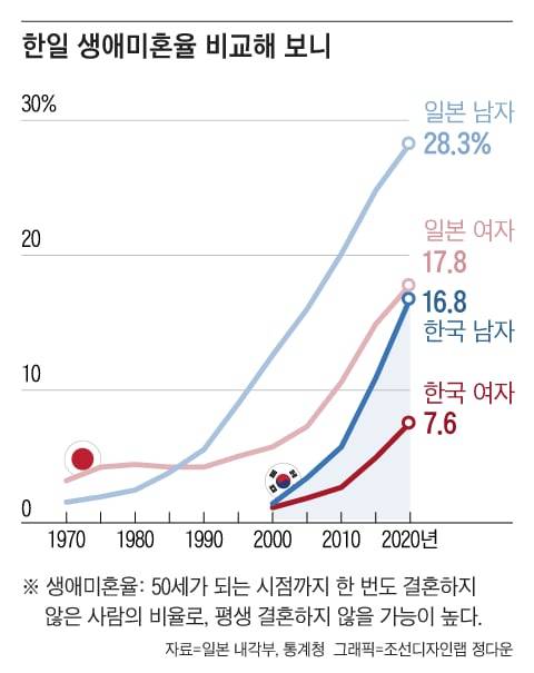 일본은 남성 생애미혼율(50세까지 한 번도 결혼하지 않은 인구 비율)이 2020년 기준 28.3%에 달한다. ‘잃어버린 30년’으로 경제가 장기 저성장 늪에 빠지면서 월급이 좀처럼 오르지 않자, 일본 남성들은 연애와 결혼을 포기했다. 참고로 한국 남성의 생애미혼율은 2020년 기준 16.8%로, 아직은 일본의 2000년대 초반 수준이다.