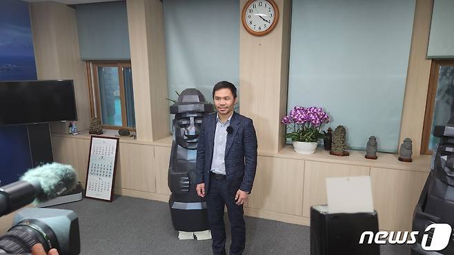 (제주=뉴스1) 강승남 기자 = '필리핀 복싱영웅' 매니 파퀴아오가 18일 제주도청을 방문해 제주의 상징인 돌하르방 조형물 앞에서 기념촬영을 하고 있다. 매니 파퀴아오는 복싱 8개 체급을 석권한 전설적인 복싱선수다. 2023.7.18/뉴스1