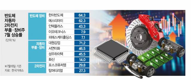 자동차 산업의 성장세가 지속될 것이라는 기대감에 부품주와 양극재 등 2차전지 소재주 주가도 치솟고 있다. 자동차 부품 기업인 코스피 상장사 대원강업(000430)은 이달 주가가 71.2% 급등했다. 서연이화(200880)(46.5%)와 성우하이텍(015750)(45.5%) 등 다른 자동차 부품주도 초강세다. 같은 기간 2%대의 하락률을 보인 현대차·기아와 차별화됐다.