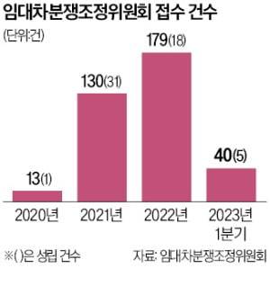 최근에는 임대료 대신 관리비 명목으로 임차료를 편법 인상하는 사례도 늘었다. 조정위 관계자는 “편법 인상이 분쟁으로 이어지는 사례가 많아 조정을 통해 재계약을 유도하고 있다”면서도 “당사자 간 합의가 되지 않는 경우가 더 많다”고 했다. 지난해 접수된 179건 분쟁 중 조정이 성립된 경우는 단 18건에 그친다. 조정이 불성립되거나 각하된 경우는 105건이고, 취하된 건수도 54건에 달한다.