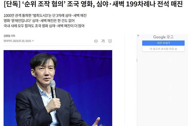 <조선일보> 7월 10일 온라인판 ''순위 조작 혐의' 조국 영화, 심야·새벽 199차례나 전석 매진' 기사가 대표적이다. 2022년 5월 개봉해 총 33만 명의 관객을 모은 다큐멘터리 <그대가 조국>과 올해 5월 31일 개봉한 <범죄도시3>의 심야상영 및 새벽 상영 횟수와 그 매진 비율을 비교했다. 전자가 심야·새벽 상영 회차의 매진 비율이 주간상영보다 월등히 높고, <범죄도시3>와 비교했을 때도 이례적으로 많은 것이 의심스럽다는 지적이다.