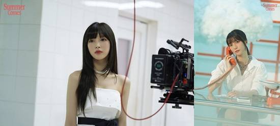 공개된 이미지에는 타이틀곡 '여름이 들려 (Summer Comes)' 뮤직비디오 촬영 현장에 있는 오마이걸 멤버들의 모습이 담겼다.