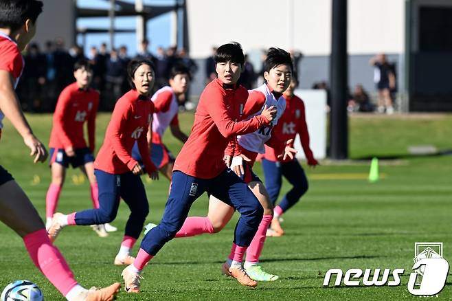 (서울=뉴스1) = 2023 FIFA 호주·뉴질랜드 여자월드컵에 참가하는 대한민국 여자축구대표팀의 지소연을 비롯한 선수들이 19일(현지시간) 호주 시드니 캠벨타운에 위치한 토마스 하셀 성공회 학교 운동장에서 현지 적응훈련을 하고 있다. (대한축구협회 제공) 2023.7.19/뉴스1