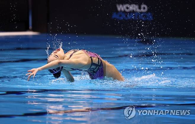(후쿠오카=연합뉴스) 윤동진 기자 = 허윤서가 19일 일본 후쿠오카 마린 메세 후쿠오카홀에서 열린 2023 세계수영선수권대회 아티스틱 스위밍 솔로 프리 결승에서 연기를 펼치고 있다. 2023.7.19