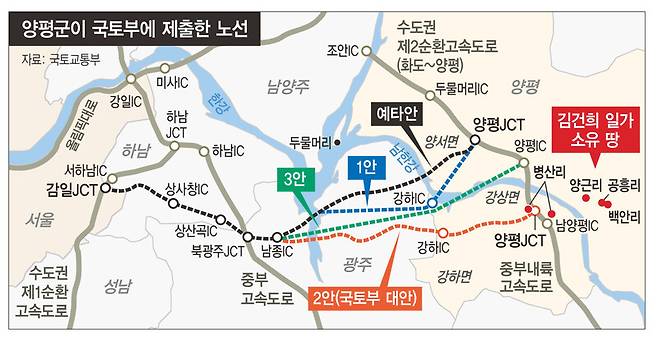 국토부의 의견 조회로부터 15일 뒤인 지난해 7월27일, ㄱ국장은 양평군이 희망하는 3개 노선안을 국토부에 공문으로 발송했다. 공문에 첨부된 문서를 보면, 양평군은 3개 노선안 가운데 2번째 노선안으로 ‘강하 나들목(IC)’을 강하면 왕창리에 설치하고 종점 격인 양평 분기점(JCT)을 강상면 병산리 부근에 설치하는 방안을 제시했다. 이는 최근 김건희 여사 일가 특혜 의혹이 불거진 국토부의 전략환경영향평가 초안 보고서에서의 최적 대안(병산리 종점안)과 일치하는 것으로, 양평군이 제시한 대안 2에서 사실상 처음 등장한다.