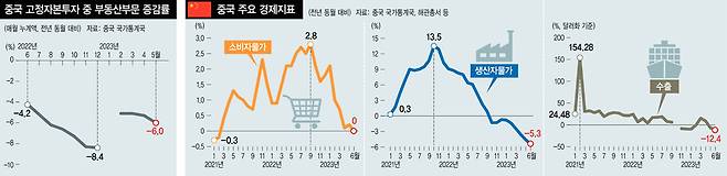 물가 둔화를 부채질한 건 올해 초에 반짝 오른 뒤에 다시 식어가는 중국 내수 경기다. 소매 판매는 지난 3∼5월 두 자릿수 증가세(이하 전년 대비)를 보이다 6월 들어 증가율이 3.1%로 확 내려앉았다. 올해 상반기(1∼6월) 고정자산 투자는 3.8% 늘었지만, 국유기업 투자를 뺀 민간 투자는 오히려 0.2% 뒷걸음질했다. 앞으로 물가 하락이 본격화하면 민간이 소비·투자를 나중으로 미루며 구조적인 불황에 빠질 수 있다는 게 디플레이션의 각본이다.