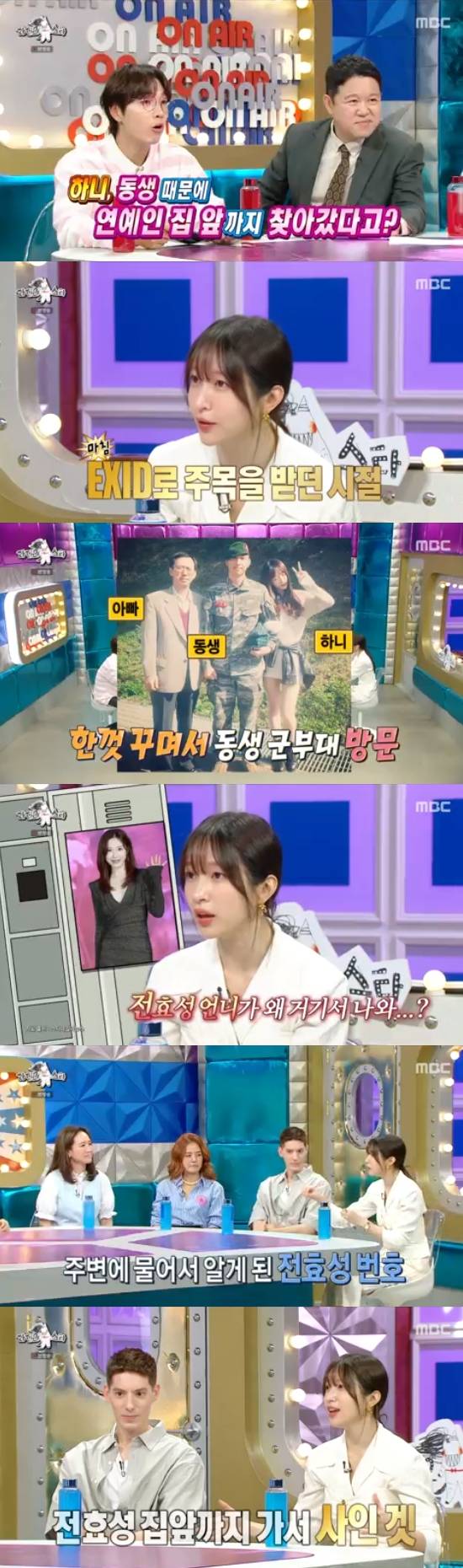 이석훈은 하니에게 "동생 때문에 연예인 집앞까지 찾아간 적이 있다는 게 무슨 말이냐"고 물었고, 하니는 "동생이 해병대를 나왔다. 그런데 '부대 개방의 날'이 있더라. 그 때가 EXID로 주목을 받기 시작할 때여서 동생의 기를 살려줄 수 있겠다는 생각이 들었다. 그래서 예쁘게 차려입고 갔는데, 동생 관물대에 전효성 언니 사진이 붙어있었다"고 했다.