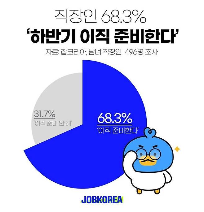 취업 플랫폼 잡코리아는 최근 직장인 496명을 대상으로 이직 준비 현황을 조사한 결과, 응답자의 68.3%가 하반기 이직을 준비 중이라고 답했다고 20일 밝혔다.