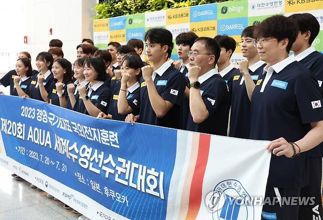 (영종도=연합뉴스) 이지은 기자 = 일본 후쿠오카에서 열리는 2023 세계수영선수권대회에 출전하는 수영대표팀 경영 선수들이 20일 오전 인천국제공항 제1터미널에서 출국하기 전 파이팅을 외치며 기념 촬영하고 있다. 2023.7.20