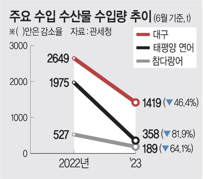 유통업계 관계자는 "여름철에는 식중독 우려로 수산물 소비가 줄긴 하지만, 지난해 같은 달에 비해 수산물 수입량이 크게 줄어든 건 후쿠시마 오염처리수 방류 논란으로 소비자들이 수산물 소비를 줄인 탓으로 보인다"고 말했다.