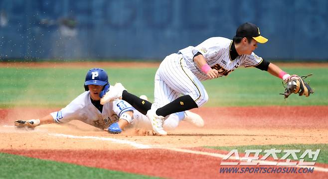제78회 청룡기 전국고교야구선수권 대회 포항제철고와 경기상업고의 경기가 20일 서울목동야구장 열렸다. 4회말 1사 1루 포항제철고 배건우 안타 때 김민중이 3루를 파고들고 있다. 신월=박재만 기자pjm@sportschosun.com/2023.07.20/