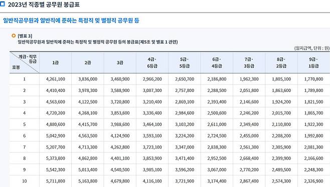 인사처에 따르면 9급 공무원 1호봉 월급은 본봉(기본급) 기준으로 177만800원이며, 7급 공무원 1호봉은 196만2300원이다. 9급 1호봉의 경우 정액 급식비 14만원과 직급보조비 17만5000원을 합치면 월봉은 208만5800원으로, 올해 최저임금(201만580원)보다 7만원 정도 많다. 소득세와 건강보험료 등 공제하기 전 세전 월급이다. 지난해 민간 대비 공무원 보수 수준은 82.8%로 역대 최저수준까지 떨어졌다. 이런 열악한 처우 때문에 젊은 20~30대 공무원들이 공직사회를 이탈하고 있다는 분석이 나온다.