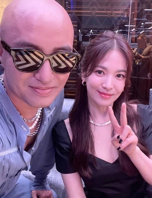 이중 특히 송혜교와 홍석천의 투샷이 눈길을 끈다. 이날 송혜교는 반묶음 헤어스타일과 블랙 드레스로 우아한 분위기를 드러냈다. 또 블랙 네일로 포인트를 줬다. 송혜교는 미소를 지으며 브이 포즈로 카메라를 바라봤다.