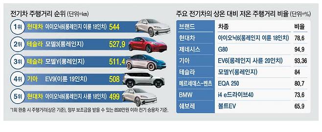 전기차는 배터리가 추위에 약해 겨울에 최대 주행거리가 뚝 떨어지는 고질적인 문제가 있다. 상온 대비 저온 주행거리 비율이 중요한 이유다. 상온과 저온 간 주행거리 차이가 덜할수록 겨울철 운행 효율이 높다는 의미다.
