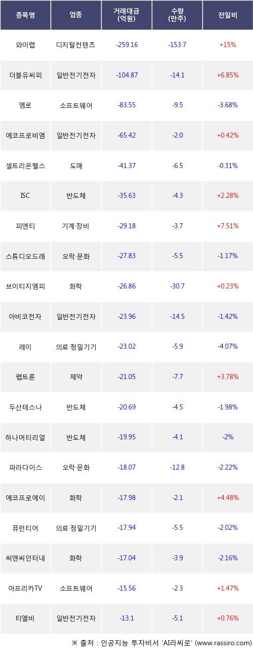기관 투자자의 순매도 상위 20개 종목은 와이랩, 더블유씨피, 엠로, 에코프로비엠, 셀트리온헬스케어, ISC, 피엔티, 스튜디오드래곤, 브이티지엠피, 아비코전자등이다.