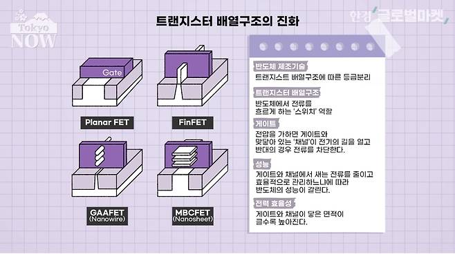반도체 제조기술은 트랜지스트 배열구조에 따라 등급을 나눌 수 있다. 트랜지스터 배열구조는 반도체에서 전류를 흐르게 하는 '스위치' 역할을 한다. 트랜지스터에서 가장 중요한 부분이 '게이트'다. 게이트에 전압을 가하면 게이트와 맞닿아 있는 '채널'이 전기의 길을 열고 반대의 경우 전류를 차단한다.