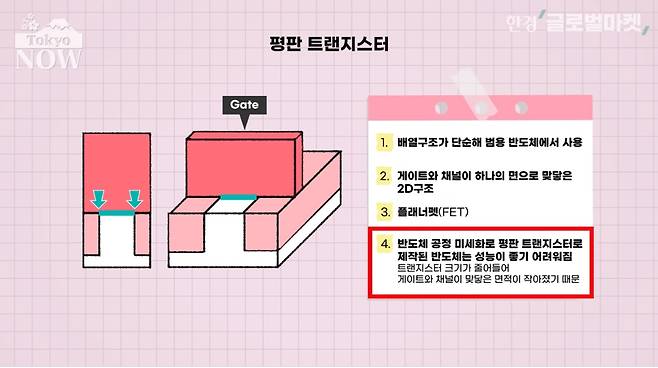 범용 반도체에는 배열구조가 가장 단순한 '평판 트랜지스터'가 사용된다. 게이트와 채널이 하나의 면으로 맞닿아 있는 '2D' 구조다. 플래너펫(FET)이라고도 한다. 반도체 공정이 미세화하면서 평판 트랜지스터로는 성능 좋은 반도체를 만들기 어렵게 됐다. 트랜지스터 크기가 줄어들면서 게이트와 채널이 맞닿는 면적이 작아졌기 때문이다.