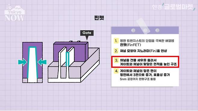 이를 극복한 배열법이 '핀펫(FinFET)'이다. 채널 모양이 지느러미(Fin)를 닮았다고 해서 붙은 이름이다. 채널을 건물을 세우듯 올려서 게이트와 채널이 맞닿는 면적을 높인 구조다. 게이트와 채널이 닿는 면이 '평면'에서 '3면'으로 늘면서 효율성도 크게 좋아졌다. 5nm 공정까지 핀펫구조가 활용된다. 최첨단 반도체 기술인 3nm 이후부터는 핀펫구조도 한계에 다다른다.