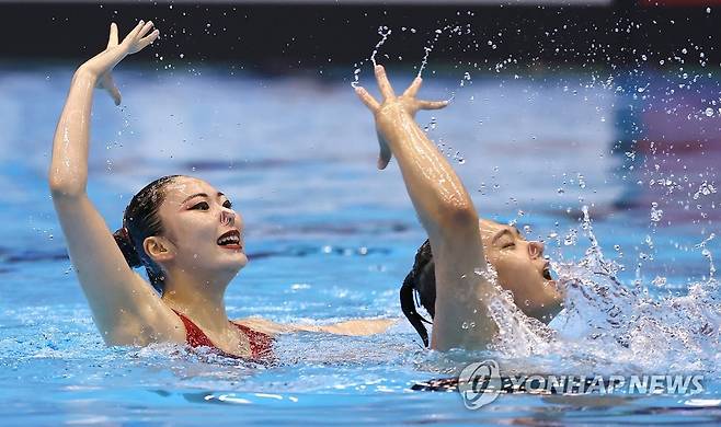 (후쿠오카=연합뉴스) 윤동진 기자 = '변재준-김지혜'가 21일 오전 일본 후쿠오카 마린 메세 후쿠오카홀에서 열린 2023 세계수영선수권대회 아티스틱 스위밍·혼성 듀엣 프리 예선에서 연기를 펼치고 있다. 2023.7.21