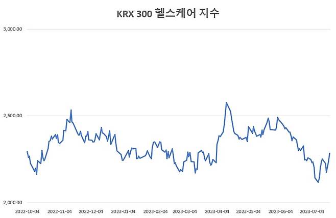 KRX300헬스케어지수는 21일 2.09% 오른2279.97에 장을 마쳤다. 이날 코스피지수 상승률(0.37%)을 1.72%포인트 따돌렸다. KRX300헬스케어지수는 연초부터 지난달 말까지 1.85% 하락, 같은 기간 14.66% 오른 코스피지수 대비 부진한 성과를 보였다. 그러나 최근에는 코스피지수 상승률보다 많이 오르고 있다. 이달 10일부터 최근까지 코스피지수와 KRX300헬스케어지수는 각각 3.53%, 7.66% 올랐다.