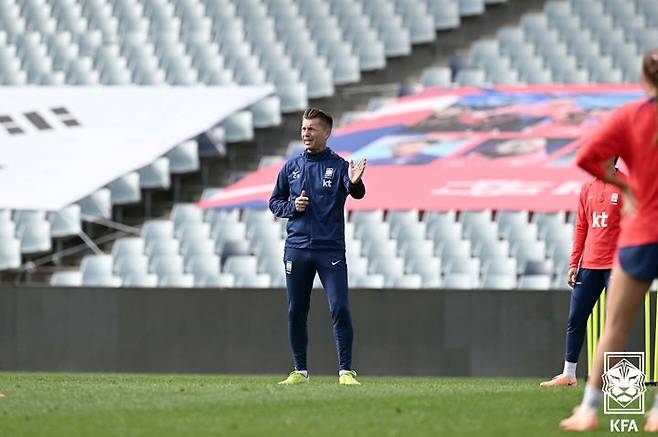 [서울=뉴시스] 2023 국제축구연맹(FIFA) 호주·뉴질랜드 여자월드컵에 출전하는 대표팀을 이끄는 콜린 벨 감독이 21일(현지시간) 호주 캠벨타운 스타디움에서 훈련 지시를 하고 있다. (사진=대한축구협회 제공) 2023.07.21. photo@newsis.com *재판매 및 DB 금지