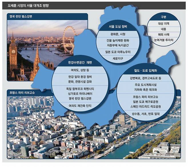이에 맞춰 오세훈 서울시장의 행보도 바빠지고 있다. 지난해 말부터 올해 6월 사이에 영국, 독일, 프랑스, 스페인, 일본 등을 돌아다니며 서울시 개발계획의 벤치마크 대상이 될 공간을 계속 찾는 모습이다. 서울시가 발표했던 공간계획과 오 시장이 방문했던 해외 도시공간을 맞춰보면 최소 20년 서울이 어떤 방향으로 변할지에 대한 대략적인 청사진까지 그려볼 수 있다. 매일경제신문이 오 시장과 서울시의 그간 행적을 분석한 결과 서울 대개조 프로젝트의 핵심은 △광화문·여의도·강남 등 3도심 재개발 △한강 수변공간 재편 △철도·도로 입체화 등으로 요약됐다.