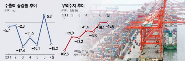 이달 들어 20일까지 수출이 반도체와 대중국 수출 부진 여파로 15% 넘게 감소하면서 하반기 수출 전선에도 찬바람이 이어지고 있다. 지난달 깜짝 흑자를 기록했던 무역수지도 다시 적자로 돌아서면서 정부가 자신한 ‘상저하고’의 경기 흐름 대신 ‘더블딥(단기 회복 후 재침체)’이 현실화하는 것 아니냐는 우려가 나온다.