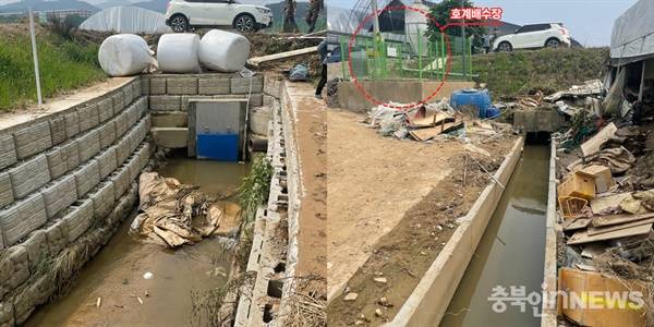 | ▲ 제방 바깥 수로에 설치된 수문 모습(좌). 제방 안 농수로와 연결된 수문 모습(우). |