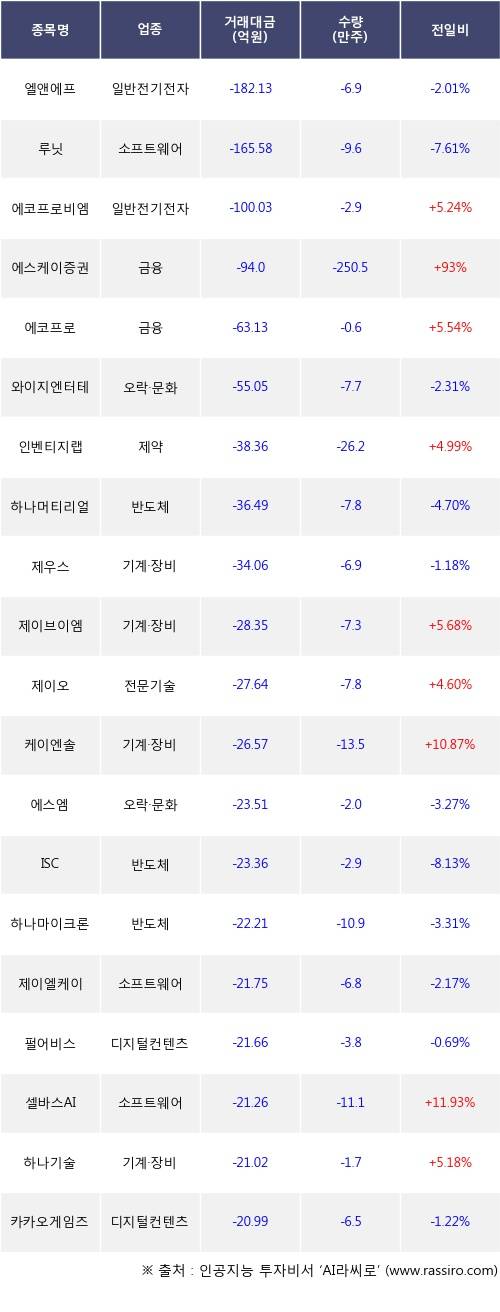 기관 투자자의 순매도 상위 20개 종목은 엘앤에프, 루닛, 에코프로비엠, 에스케이증권제9호스팩, 에코프로, 와이지엔터테인먼트, 인벤티지랩, 하나머티리얼즈, 제우스, 제이브이엠등이다.