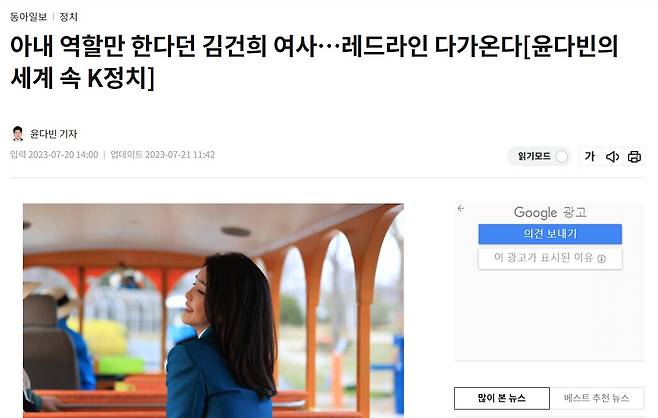 21일 오전 포털 다음의 PC 뉴스면 톱기사에 배치된 <동아일보> '윤다빈의 세계 속 K정치' 기사다. 소위 '빨간불'로 대체할 수 있을 '레드라인'이란 제목 내 표현이 눈길을 끈다. 해당 기사는 과거 미국 트럼프 전 대통령의 부인 멜라니 여사, 자이르 보우소나루 브라질 전 대통령의 부인 미셸 보우소나루 여사의 국정 개입 의혹을 소개하며 김건희 여사의 행보와 해외 정상 영부인들의 경우를 비교 분석하고 있었다.