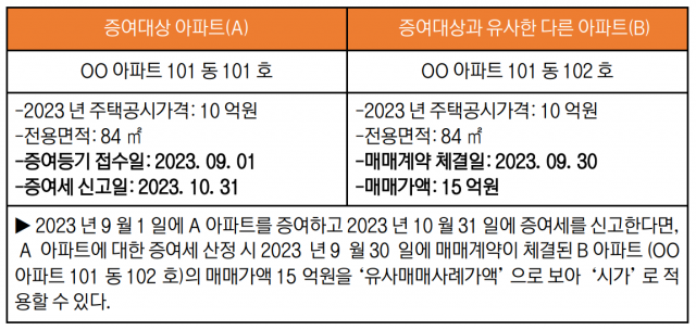 자녀에게 증여하거나 양도하고자 하는 아파트의 ‘시가’를 산정하기 어려운 경우라면 한 가지 더 확인해야 할 사항이 있다. 바로 증여 또는 양도하는 아파트와 면적·위치·용도 등이 동일하거나 유사한 다른 아파트의 ‘유사매매사례가액’이 있는지를 반드시 확인해야 한다.