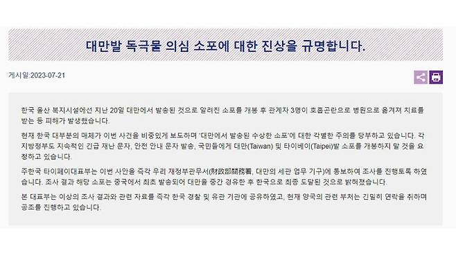 주한 타이베이 대표부 "수상한 소포, 중국서 발송 타이완 경유"