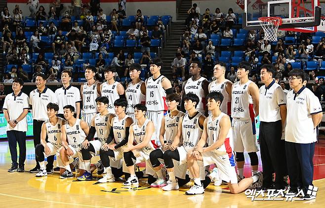 (엑스포츠뉴스 잠실학생체, 김한준 기자) 22일 오후 서울 송파구 잠실학생체육관에서 열린 'KB국민은행 2023 남자농구 국가대표 평가전' 대한민국과 일본의 경기, 경기 전 대한민국 선수단이 기념촬영을 갖고 있다.