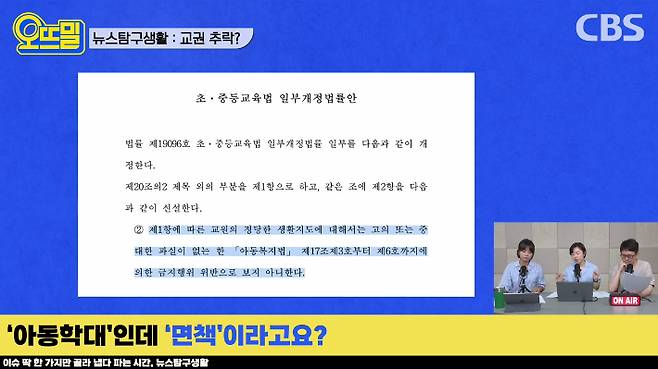 ◆ 신혜림> 학폭 이슈가 불거지니까 그걸 잡겠다고 교사 권리랑 학생 권리를 대립시키는 발언을 국무총리가 한 거잖아요. 이 방향성에 따라서 국회도 움직였거든요. 여당에서 지난 5월에 법안을 제출했는데 이 법안이 학교랑 학부모를 갈라치기 하는 불쏘시개가 되고 있다는 분석이 나오고 있어요. 교육위 국민의힘 간사인 이태규 의원이 초중등교육법 개정안 대표 발의를 했는데, '정당한 생활지도에 대해서는 고의 또는 중대한 과실이 없는 한 아동학대로 보지 않는다'