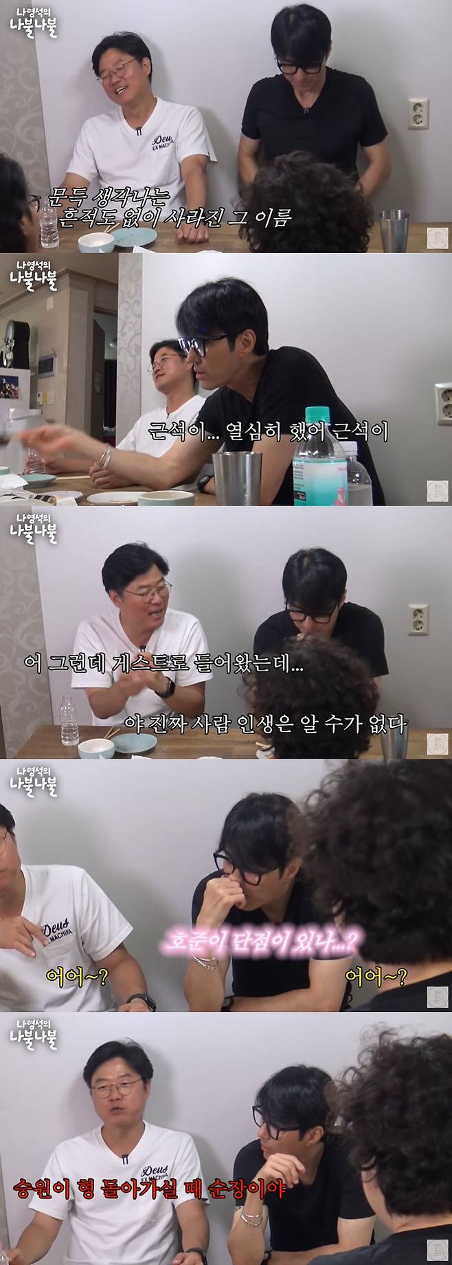 이우정 작가는 이번에 단점을 물었고 차승원은 "호준이 단점이 있나? 호준이 단점이 있어?"라고 되물었다. 이에 나영석은 "호준이도 내가 볼 때 승원이 형 돌아가실 때 순장이야"라고 밝혀 웃음을 안겼다.