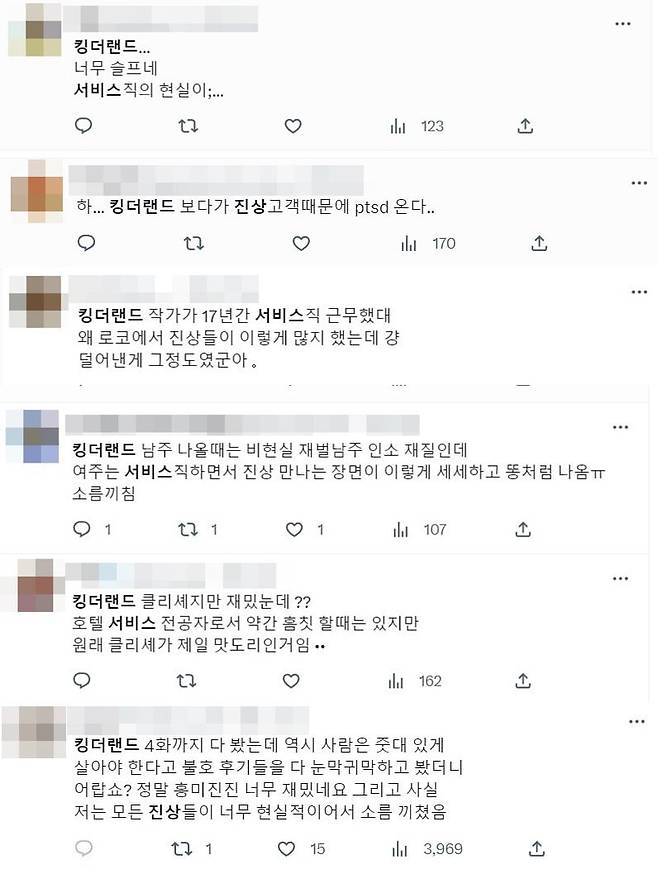 무례한 손님에 학벌 차별, 텃세, 매출 압박 등 서비스직에서 겪는 디테일한 묘사에 놀랐다는 시청자도 적지 않은데 '킹더랜드' 최롬 작가는 17년간 서비스업에서 근무한 경험을 바탕으로 대본을 집필한 것으로 알려졌다.