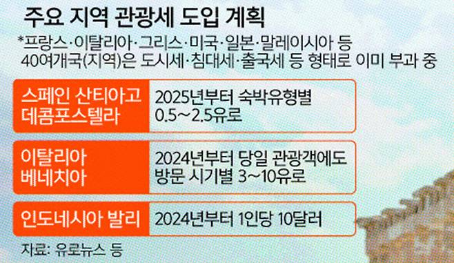 최근 관광객이 급증하자 새로 도입을 검토 중인 곳도 많다. 산티아고 순례길의 종착지인 스페인 산티아고데콤포스텔라가 대표적이다. 범유럽 매체 유로뉴스에 따르면 고레티 산마르틴 시장은 2025년부터 숙박 유형별로 0.5∼2.5유로(712∼3560원)의 관광세를 거두겠다는 전임자의 계획을 이어받겠다고 밝혔다. 그는 연간 최대 300만유로(43억원)로 예상되는 관광세 수익을 역사 보전, 지역 주민을 위한 주택 확보 등에 쓰겠다며 “관광산업을 즐기면서도 편안하고 여유로운 도시를 만들겠다”고 했다. 인도네시아 발리 역시 내년부터 외국인 관광객에게 1인당 10달러(1만2600원)의 관광세를 걷기로 했다. 이미 숙박료에 관광세를 포함 중인 이탈리아 베네치아는 내년부터 당일치기 여행객에게도 3∼10유로(4274∼1만4248원)의 입장료를 받을 계획이다.