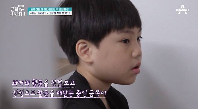 다음 솔루션은 '건강한 죄책감 갖기'였다. 엄마와 아빠는 학교에서의 영상을 금쪽이와 함께 보며 잘못을 명확히 지적하고 올바른 행동의 예시를 가르쳤다. 친구들을 때리고 괴롭히는 모습, 힘들어 하는 교감 선생님을 보며 금쪽이도 많이 놀란 듯 말이 없어졌다. 엄마 아빠는 참담한 장면을 보며 눈물을 훔쳤다. 금쪽이도 자신의 잘못에 대해 진정한 반성을 하기 시작했다.