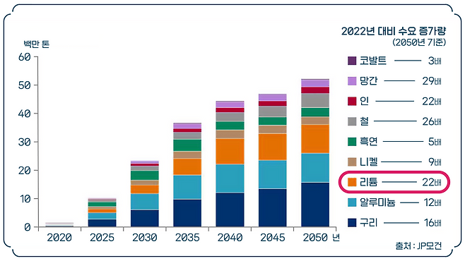 특히 리튬은 지금보다 앞으로가 더 중요한 자원입니다. 최근 나온 JP모건의 최신 에너지 관련 보고서를 보면 "친환경 배터리 수요가 늘어나면서 리튬, 코발트, 망간, 니켈, 알루미늄, 인 같은 자원들의 중요성이 크게 높아질 것인데, 리튬의 경우 2050년이 되면 지금보다 수요가 22배 더 늘어날 것"이라고 되어 있습니다.