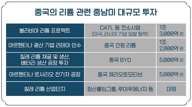 BBC는 볼리비아, 아르헨티나, 칠레 같은 '리튬 트라이앵글' 국가들에 대한 중국의 접근이 강화됐는데, 특히 자금 넉넉한 중국 기업들이 돈을 투자하는 형식의 진출이 도드라진다고 분석했습니다.