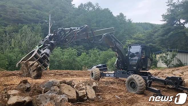 (예천=뉴스1) 최창호 기자 = 23일 육군 3공병여단이 집중호우 피해지역인 경북 봉화군 춘양면에서 특수 장비인 스파이더 굴삭기를 투입 낙석 등을 치우고 있다. 스파이더 굴삭기는 산악 지형 등에서 작전이 가능한 특수장비다.(육군 제50보병사단 제공)2023.7.23/뉴스1