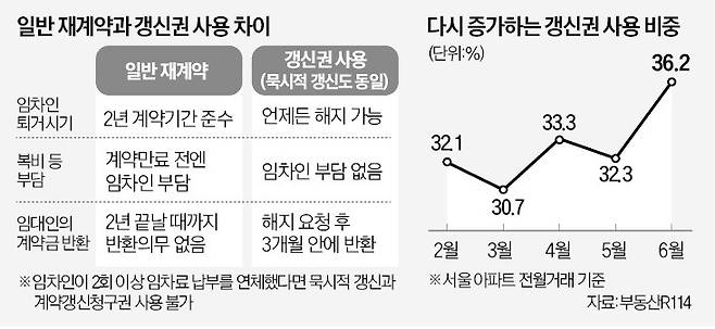 전문가들은 최대한 갱신권 사용 없이 세입자와 재계약을 맺는 게 좋다고 조언한다. 재계약을 맺으면 세입자는 2년 계약기간을 반드시 준수해야 한다. 중간에 세입자가 나가겠다고 해도 집주인이 보증금을 반환할 의무도, 중개사비 등을 부담할 필요도 없다. 정보현 NH투자증권 부동산 수석연구원은 “갱신계약을 맺었다면 3개월 안에 보증금을 마련할 수 있도록 대비하는 게 좋다”며 “이달 말부터 1년 한시적으로 보증금 반환 대출 규제가 완화되기 때문에 총부채상환비율(DTI) 60% 수준 등을 확인해 보면 좋다”고 말했다.