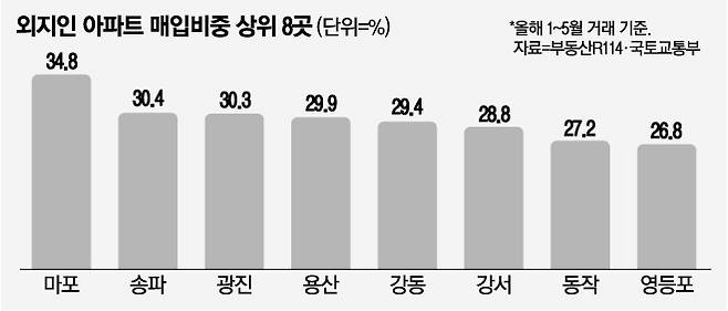 서울 안에서 전년 동기 대비 외지인 매입 비중이 가장 큰 폭 늘어난 곳은 강남구였다. 작년 1∼5월 거래된 강남구 아파트 10005건 중 외지인 거래는 119건으로 비중이 12%에 불과했으나, 올해는 849건 중 213건(25%)으로 13%포인트 늘었다.