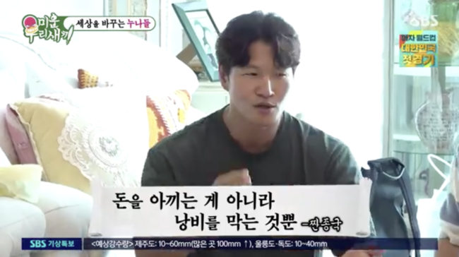 이어 김종민은 “저번에 형 집에서 휴지 두 칸 썼다가 맞을 뻔했다”고 폭로했고, 김종국은 “한 장만 써도 되는데 왜 두 장을 쓰냐. 나는 돈을 아끼는 게 아니라. 낭비를 막는 것”이라고 항변했다. 또한 이성민은 “물티슈 재사용은 어떠냐”라고 말했고, 김종국은 “중요한 건 어디에 썼냐다. 기름 설거지 한 그릇에 썼다”고 항변했다.