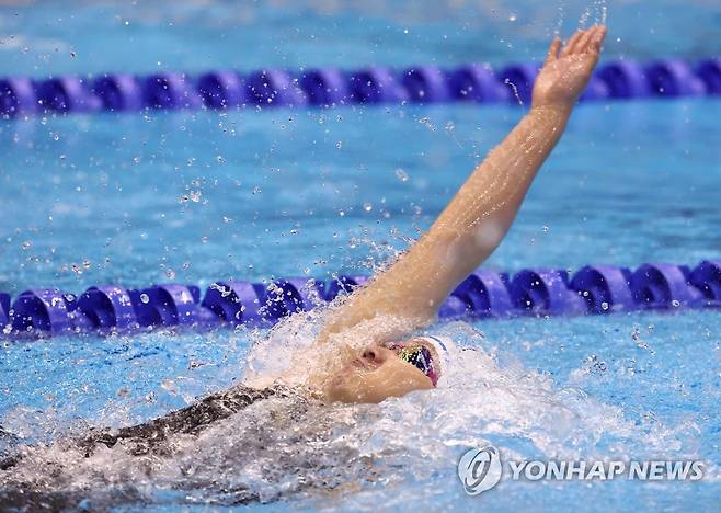(후쿠오카=연합뉴스) 윤동진 기자 = 이은지가 24일 일본 후쿠오카 마린 메세 후쿠오카홀에서 열린 2023세계수영선수권 여자 배영 100m 예선에서 역영하고 있다. 2023.7.24