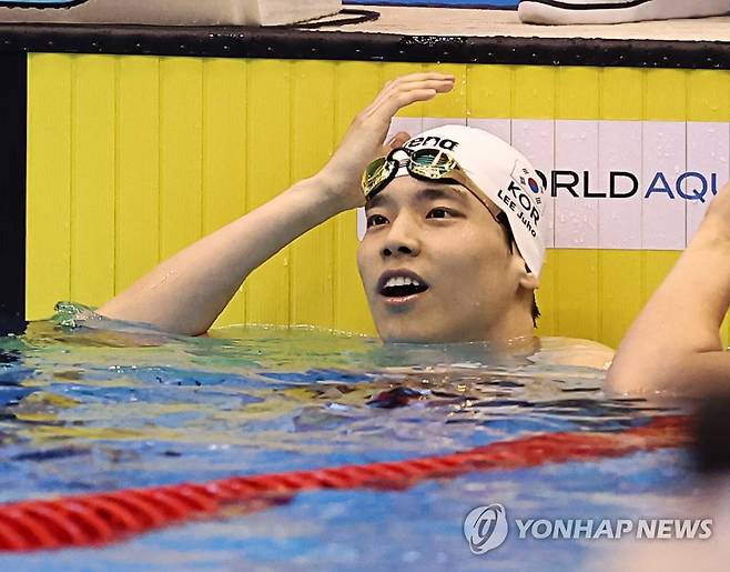 (후쿠오카=연합뉴스) 윤동진 기자 = 이주호가 24일 일본 후쿠오카 마린 메세 후쿠오카홀에서 열린 2023세계수영선수권 남자 배영 100m 예선 경기를 마친 후 결과를 확인하고 있다. 2023.7.24