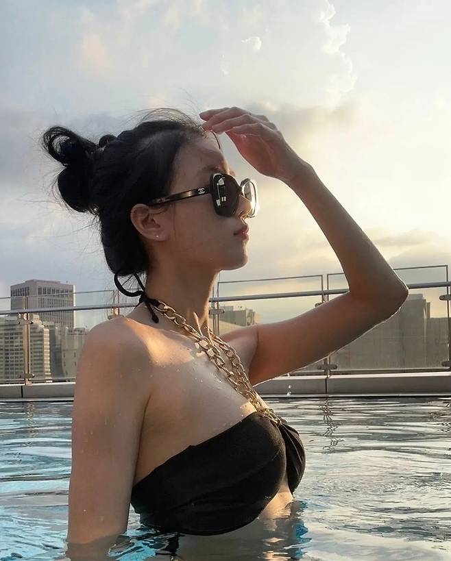 공개한 사진에는 검은 비키니를 걸친 이미주가 수영장에서 몸매를 뽐내고 있어 눈길을 끌었다.