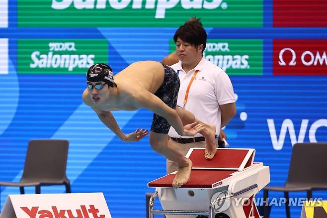 (후쿠오카=연합뉴스) 윤동진 기자 = 황선우가 24일 일본 후쿠오카 마린 메세 후쿠오카홀에서 열린 2023세계수영선수권 남자 자유형 200m 예선에서 입수하고 있다. 2023.7.24