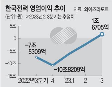 2021년 2분기 이후 영업적자 행진을 이어가던 한국전력공사가 올 3분기에는 1조6000억 원대 이익을 내면서 10분기 만에 마침내 흑자 전환할 것이라는 전망이 나오고 있다. 에너지 가격 안정·전기요금 인상·원전 이용률 제고 등 윤석열 정부의 에너지정책 정상화가 복합적으로 작용한 결과라는 분석이다. 다만, 올 2분기까지 쌓인 것으로 추정되는 47조 원대 누적 적자와 향후 전기요금 인하 변수가 여전히 부담으로 남을 것으로 보인다. 24일 금융정보업체 와이즈리포트에 따르면, 증권사들은 올 3분기 한전이 1조6705억 원 영업이익(자회사를 포함한 연결기준)을 낼 것으로 추정했다. LNG 등 국제 에너지 가격 하락에 따른 원료비와 전력 구입비 감소가 본격화할 것으로 예상된 데 따른 것이다. 지난해 9월부터 올 3월까지 kWh당 200원대를 이어온 전력도매가격(SMP·한전이 발전사들로부터 사오는 전력 가격)은 6월 147.71원까지 떨어졌다. 한화투자증권은 최근 보고서에서 “LNG 가격 하락으로 전력도매가격도 빠르게 내려가고 있는 추세로 3분기 평균으로는 120원대가 전망된다”고 말했다.