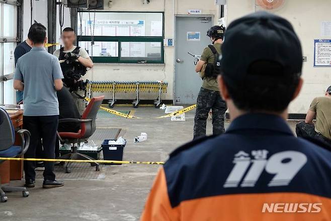 [제주=뉴시스] 오영재 기자 = 24일 오전 제주시 노형동 제주우편집중국에서 대만발 정체불명 우편물 신고가 접수돼 군·경 등이 현장에서 유해물질 검사 등을 하고 있다. 2023.07.24. oyj4343@newsis.com